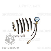 Комплектуется высокоточным манометром, диаметром 63 мм, ценой деления 0,1 бар, адаптерами, позволяющими производить измерения на автомобилях ВАЗ (ГАЗ - топливные рейки которых оснащены портом Шредера с резьбой 7/16"-20UNF).