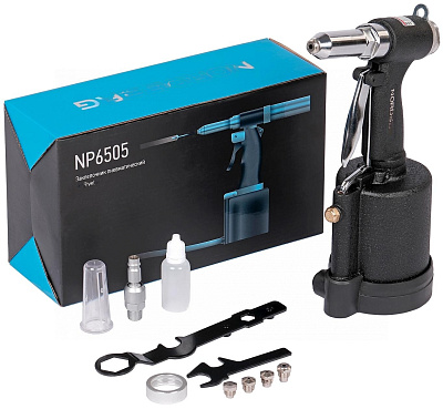 В комплект входят 4 сменных стандартных носовых наконечника, коллектор оправки заклепки, два сервисных комбинированных ключа и щетка.