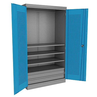 Шкафы инструментальные предназначены для размещения и хранения инструмента, оснастки, комплектующих изделий, ручного электрического инструмента и рабочей документации на рабочем месте. Прочная конструкция из листовой стали способна выдерживать большие нагрузки на полки и выдвижные ящики, и обеспечивает хорошую устойчивость. Оснащены различными комбинациями полок и ящиков, что способствует оптимальной организации рабочего места с учетом специфики производства. Шкаф дополнительно можно оборудовать ящиками, полками и другими элементами для эргономичного размещения инструментов. Шаг перфорации на боковых стенках позволяет устанавливать полки под оснастку как в горизонтальном, так и наклонном виде. Возможно дополнительно укомплектовать шкаф элементами для верхней погрузки и погрузки роклой (вилочного погрузчика). Шкаф оснащен:надежным замком-бабочкой;