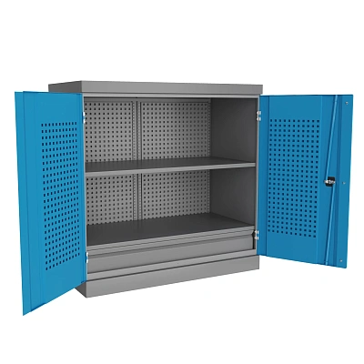 Компактный и прочный металлический шкаф с надежной системой запирания и возможностью гибкой комплектации, идеально подходит для мастерских и производственных помещений.