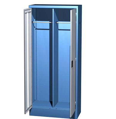Шкаф универсальный двухсекционный с двумя ригельными замками.Комплектуется 2-мя перекладинами для вешалки под одежду.