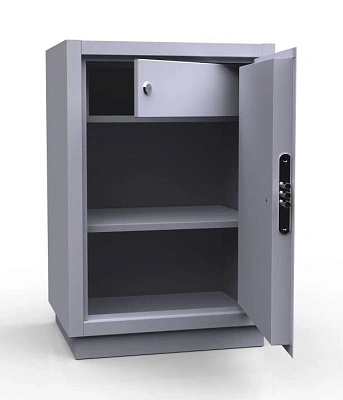 Корпус имеет сварную конструкцию из холоднокатаной стали. Размеры и шаг между полками рассчитаны под вертикальное размещение папок-регистраторов. Доступны две модификации: с полками либо с трейзером для ценностей; съемные полки позволяют размещать крупные предметы. Дверь усилена. Защиту обеспечивают замок сувальдного типа «ПРО САМ» (3 ключа) и почтовый замок Euro-Locks (2 ключа). Покрытие — порошковая краска светло-серого цвета (RAL 7035).