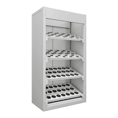 Ключевые параметры: формат хранения — A4 в папках-регистраторах; тип конструкции — сварная; материал — холоднокатаная сталь; покрытие — порошковая краска светло-серого цвета.
