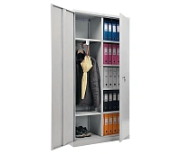 Шкаф состоит из двух секций, одна из которых предназначена для офисных нужд, то есть хранения бумаг, папок и канцелярских принадлежностей, а вторая – для верхней или рабочей одежды сотрудников, обуви, сумок, рюкзаков, зонтов, головных уборов.
