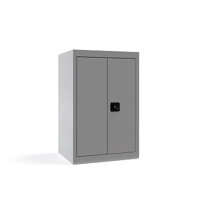 Компактный стальной шкаф для офиса: регулируемые полки, надёжный замок Euro-Locks, светло-серое порошковое покрытие, поставка в разборе и быстрая сборка заклёпками.