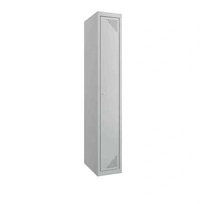 Надежный односекционный стальной шкаф с вентиляцией и защищенным замком: удобные полка, перекладина и крючки, возможность добавить обувную полку. Подходит для компаний, спортцентров и учебных заведений.