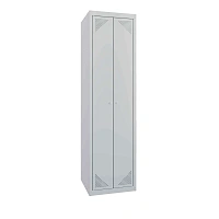 Двухсекционный металлический шкаф для одежды имеет полную внутреннюю комплектацию: полки для головных уборов, пластиковые перекладины для вешалок и четыре крючка для одежды. Размер секций обеспечивает комфортное размещение верхней одежды, в том числе зимней. Конструкция предусматривает возможность установки дополнительной полки для обуви.