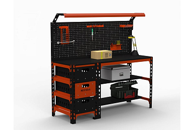 Металлический стол предназначен для удобной организации отдельного рабочего места на производствах, складах, гаражах, мастерских, и на других объектах. Модель оснащена светодиодным комплектом освещения. Конструкция имеет прочные опоры из углового профиля. Наличие трёх ящиков позволяет разместить необходимый рабочий материал под рукой и использовать их в рациональном хранении. Столешница выполнена из прочного листового металла и выдерживает значительные нагрузки. Стойки траверсы стола выполнены из стали толщиной 2мм, столешница и полки –толщиной 1. 5 мм. Не используются шарико-телескопические направляющие, ящики выдвигаются на основе металлических направляющих толщиной 2 мм, что позволяет увеличить нагрузку на ящики и их долговечность. По желанию ящики можно расположить с необходимой пользователю стороны. Имеется перфопанель для создания рабочей зоны и хранения различных инструментов. На панели легко разместить дополнительные аксессуары – ключи, лотки, держатели и так далее. Перфопанель имеет отверстия двух видов: первый под аксессуары производства Металекс; второй под стандартные аксессуары с круглым креплением. Шаг перфорации 25 мм. Отверстия диаметром 5 мм. Цвет: оранжево-чёрный.