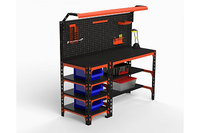 Металлический стол предназначен для удобной организации отдельного рабочего места на производствах, складах, гаражах, мастерских, и на других объектах. Модель оснащена светодиодным комплектом освещения. Обеспечивает комфортную работу пользователя. Конструкция имеет прочные опоры из углового профиля. Специальная перфорация позволяет изменить высоту полок. Столешница выполнена из прочного листового металла и выдерживает значительные нагрузки. Можно использовать в столярных и слесарных мастерских. Рациональное хранение различных предметов на полках. Стойки траверсы стола выполнены из стали толщиной 2 мм, столешница - толщиной 1. 5 мм, а полки - 0. 8 мм. Конструкция сборно-разборная, помимо самой столешницы имеется 2 основные и 3 боковые полки. Цвет: оранжево-чёрный.Допустимая нагрузка на конструкцию – до 260 кг.