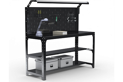 Стол металлический Металекс серия KIT 750х1100х400 мм, 2-е полки мм, перфопанель с комплектом освещения, черный 201614