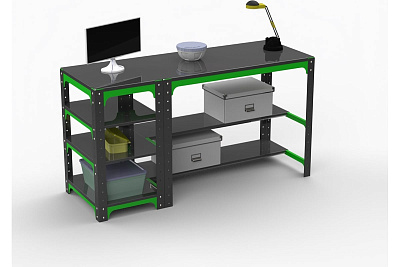 Металлический стол с двумя полками (чёрный) предназначен для удобной организации рабочего места. Используется на производствах, складах, в гаражах, мастерских и других объектах. Благодаря болтовому соединению имеет возможность многократной сборки/разборки конструкции. Помимо столешницы имеются дополнительные нижние полки-2шт. Возможность легкого объединения с другими моделями столов, тумб с полками ,столов с ящиками и другими изделиями серии KIT. При соединении болта с гайкой дают прочную затяжку элементов. Преимуществами данного стола являются его практичность, мобильность, прочность и долговечность в использовании. Стол выполнен из стали толщиной 1,5 мм. Полка выполнена из стали 0,8 мм. Крепление: болтовое. Цвет: чёрный. Порошковая покраска.