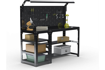Металлический стол (2-е полки + перфопанель с комплектом освещения) (черный) предназначен для удобной организации рабочего места. Используется на производствах, складах, в гаражах, мастерских и других объектах. Благодаря болтовому соединению имеет возможность многократной сборки/разборки конструкции. Помимо столешницы имеются дополнительные нижние полки - 2 шт. Перфопанель с комплектом аксессуаров является дополнительный элементом, который увеличивает рабочее пространство и структурирует хранение инструмента. Толщина перфопанели 0.8 мм. Комплект освещения обеспечивает удобство в работе.Возможность легкого объединения с другими моделями столов, тумб с полками, столов с ящиками и другими изделиями серии KIT. При соединении болта с гайкой достигается прочная затяжка элементов. Преимуществами данного стола являются его практичность, мобильность, прочность и долговечность в использовании. Стол выполнен из стали толщиной 1,5 мм. Полка выполнена из стали 0,8 мм. Крепление: болтовое. Цвет:чёрный.Порошковая покраска.