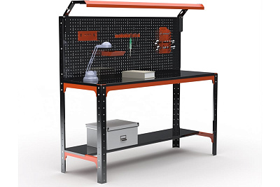 Металлический стол с одной полкой , перфопанелью и комплектом освещения предназначен для удобной организации рабочего места. Используется на производствах, складах, в гаражах, мастерских и других объектах. Благодаря болтовому соединению имеет возможность многократной сборки/разборки конструкции. Помимо столешницы имеется дополнительная нижняя полка - 1 шт. Перфопанель с комплектом аксессуаров является дополнительными элементом, который увеличивает рабочее пространство и структурирует хранение инструмента. Комплект освещения обеспечивает удобство в работе. Толщина перфопанели 0. 8 мм. Возможность легкого объединения с другими моделями столов, тумб с полками, столов с ящиками и другими изделиями серии KIT. При соединении болта с гайкой дают прочную затяжку элементов. Преимуществами данного стола являются его практичность, мобильность, прочность и долговечность в использовании. Стол выполнен из стали толщиной 1, 5 мм. Полка выполнена из стали 0, 8 мм. Крепление: болтовое. Цвет: оранжево-чёрный. Порошковая покраска.Технические характеристики