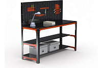 Металлический стол предназначен для удобной организации рабочего места. Используется на производствах, складах, в гаражах, мастерских и других объектах. Благодаря болтовому соединению имеет возможность многократной сборки, рост разборки конструкции. Помимо столешницы имеются дополнительные нижние полки - 2 шт. Перфопанель с комплектом аксессуаров является дополнительный элементом, который увеличивает рабочее пространство и структурирует хранение инструмента. Толщина перфопанели 0. 8 мм. Возможность легкого объединения с другими моделями столов, тумб с полками, столов с ящиками и другими изделиями серии KIT. При соединении болта с гайкой достигается прочная затяжка элементов. Преимуществами данного стола являются его практичность, мобильность, прочность и долговечность в использовании. Стол выполнен из стали толщиной 1,5 мм. Полка выполнена из стали 0,8 мм. Крепление: болтовое. Цвет: оранжево-чёрный. Порошковая покраска.Технические характеристики