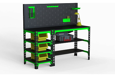 Металлический стол с одной полкой , перфопанелью и комплектом освещения предназначен для удобной организации рабочего места. Используется на производствах, складах, в гаражах, мастерских и других объектах. Благодаря болтовому соединению имеет возможность многократной сборки/разборки конструкции. Помимо столешницы имеется дополнительная нижняя полка - 1 шт. Перфопанель с комплектом аксессуаров является дополнительными элементом, который увеличивает рабочее пространство и структурирует хранение инструмента. Комплект освещения обеспечивает удобство в работе. Толщина перфопанели 0. 8 мм. Возможность легкого объединения с другими моделями столов, тумб с полками, столов с ящиками и другими изделиями серии KIT. При соединении болта с гайкой дают прочную затяжку элементов. Преимуществами данного стола являются его практичность, мобильность, прочность и долговечность в использовании. Стол выполнен из стали толщиной 1, 5 мм. Полка выполнена из стали 0, 8 мм. Крепление: болтовое. Цвет: оранжево-чёрный. Порошковая покраска.Технические характеристики