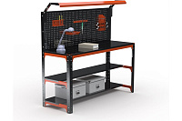 Металлический стол (2-е полки + перфопанель с комплектом освещения) предназначен для удобной организации рабочего места. Используется на производствах, складах, в гаражах, мастерских и других объектах. Благодаря болтовому соединению имеет возможность многократной сборки/разборки конструкции. Помимо столешницы имеются дополнительные нижние полки - 2 шт. Перфопанель с комплектом аксессуаров является дополнительный элементом, который увеличивает рабочее пространство и структурирует хранение инструмента. Толщина перфопанели 0. 8 мм. Комплект освещения обеспечивает удобство в работе. Возможность легкого объединения с другими моделями столов, тумб с полками, столов с ящиками и другими изделиями серии KIT. При соединении болта с гайкой достигается прочная затяжка элементов. Преимуществами данного стола являются его практичность, мобильность, прочность и долговечность в использовании. Стол выполнен из стали толщиной 1, 5 мм. Полка выполнена из стали 0, 8 мм. Крепление: болтовое. Цвет: оранжево-черный. Порошковая покраска.Технические характеристики