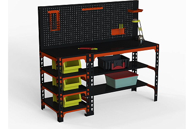 Металлический стол предназначен для удобной организации отдельного рабочего места на производствах, складах, гаражах, мастерских, и на других объектах. Конструкция имеет прочные опоры из углового профиля. Специальная перфорация позволяет изменить высоту полок.