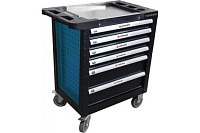 Модель имеет 6 выдвижных ящиков и 2 боковые перфорации для дополнительного размещения инструмента. Прочные колеса позволяют легко маневрировать по рабочей площадке.