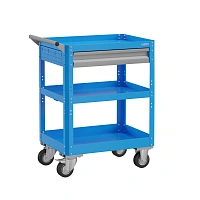 Тележка с выдвижным ящиком на шариковых телескопических направляющих предназначена для хранения и перевозки инструмента на производстве и в сервисе. Корпус выполнен из листовой стали толщиной 0,6–1,5 мм, покрытие – полимерно-порошковое (серый цвет). Верхняя и средняя полка имеют бортик 40 мм, нижняя – 60 мм. Равномерно распределённая нагрузка на тележку – до 100 кг. Габариты: 800×600×450 мм.
