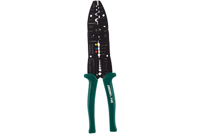 Профессиональный обжиматель контактов 8 в 1 Jonnesway V1402 оснащен специальной рукояткой, которая не пропускает электрический ток. Рабочая поверхность разделена на три части, для разного вида клемм.