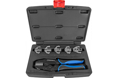 Обжимные клещи со вставками в наборе, 7 предметов Jonnesway AR030058 49993 предназначены для электромонтажных работ, где используются провода различного сечения и возможна установка контактных клемм, штекеров и различного вида коннекторов.