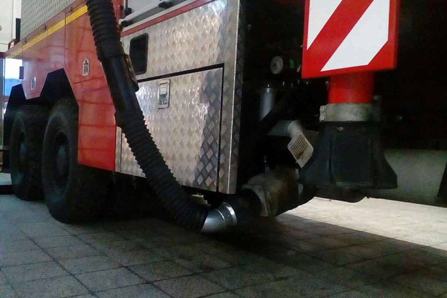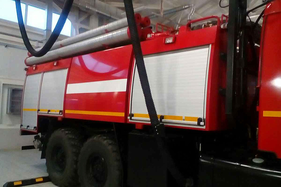 В данном проекте поставлялось 4 комплекта трековой системы, состоящей из направляющего рельса длиной 6 м, девятиметрового шланга тип NR-B, каретки с балансиром, пневматической насадки, компонентов управления подачи сжатого воздуха и сброса давления, которые необходимы для автоматического включения вентилятора при запуске двигателя автомобиля, и расстыковочного узла, благодаря которому пневматическая насадка отсоединяется от выхлопной трубы при выезде автомобиля из бокса. Т.е. данные системы полностью отвечают условиям работы пожарного депо.