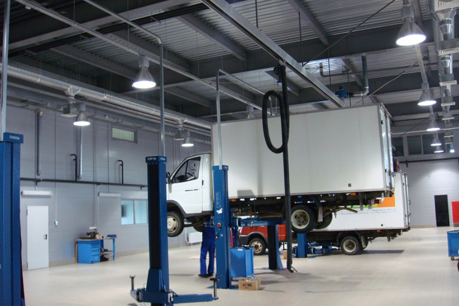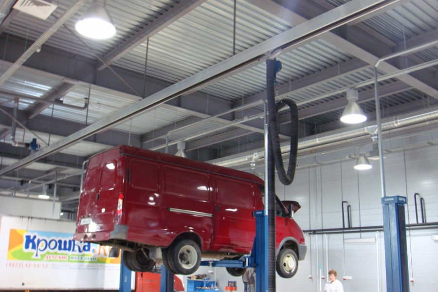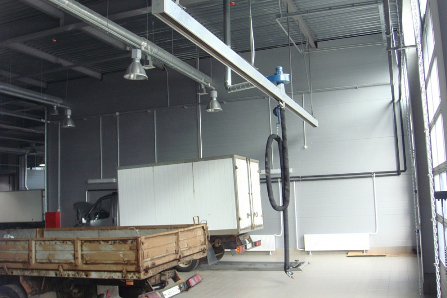 - вытяжная система, рельсовая система Norfi для вытяжки отработанных газов на слесарных постах и посте «прямой приемки» автомобиля, общая длина рельсовой вытяжной системы 72 метра.